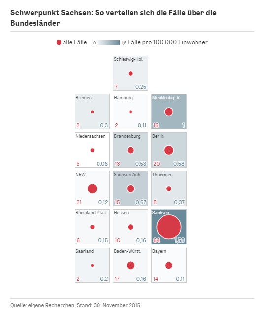 Kein Bundesland blieb von diesen Überfällen verschont, am schwersten betroffen ist Sachsen, sowohl in absoluten Zahlen als auch im Verhältnis zur Einwohnerzahl.