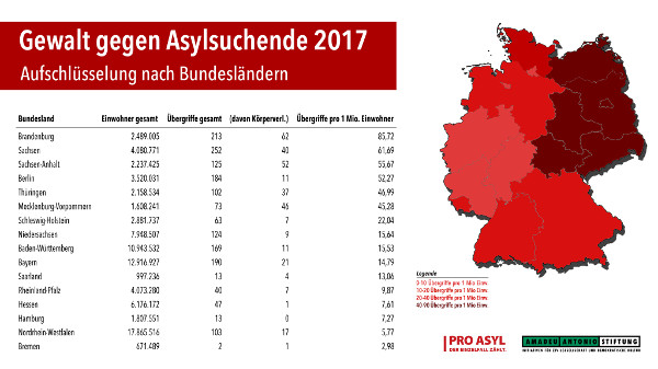 Trotz deutlich rückläufiger Zahlen von Asylsuchenden bleibt rassistisch motivierte Gewalt gegen Geflüchtete ein deutschlandweites, flächendeckendes Problem. Die Amadeu Antonio Stiftung und Pro Asyl dokumentieren für das Jahr 2017 in ihrer gemeinsamen Chronik flüchtlingsfeindlicher Vorfälle bundesweit 1.713 Straftaten, die sich gegen Geflüchtete richten. Das sind im Schnitt 4,6 Straftaten täglich.