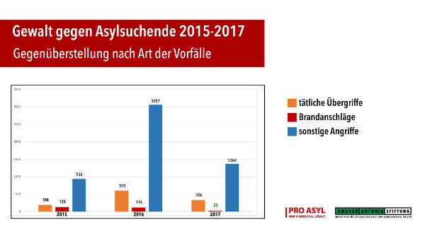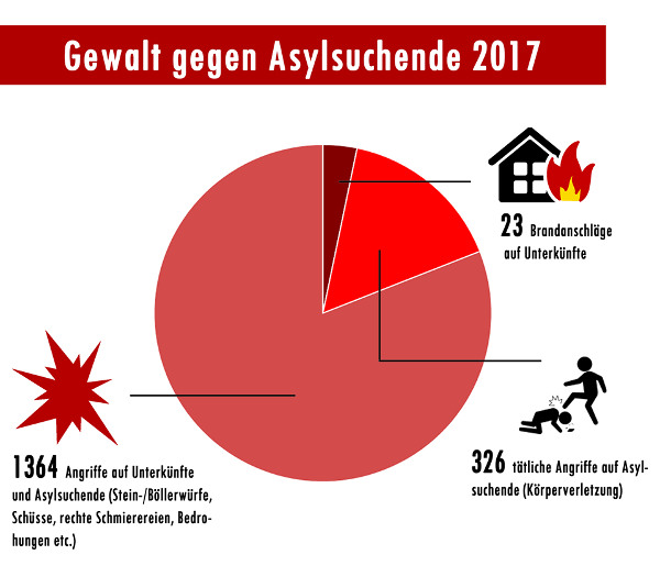 Unter den 1.713 Angriffen auf Asylsuchende und ihre Unterkünfte 2017 sind 23 Brandanschläge und 1.364 sonstige Übergriffe wie Sprengstoffanschläge, Steinwürfe, Schüsse, aber auch Hakenkreuz-Schmierereien und andere Formen von Volksverhetzung und weitere Hass-Propaganda. Daneben dokumentiert die Chronik 326 tätliche flüchtlingsfeindliche Übergriffe wie Angriffe mit Messern, Schlag- oder Schusswaffen und Faustschläge.