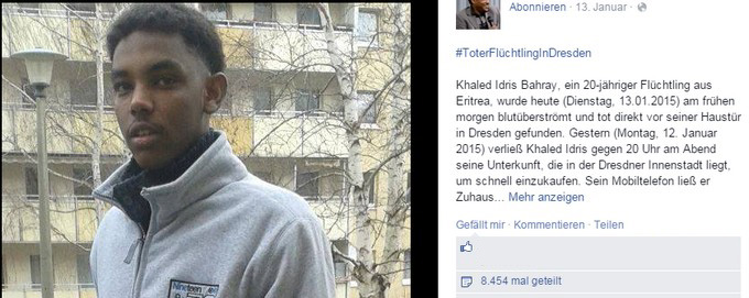 Keinen rechtsextremen Hintergrund hatte nach aktuellem Erkenntnisstand trotz zeitlicher Nähe zur Pegida-Demonstration am 12.01.2015 in Dresden der Mord an dem 20-jährigen Flüchtling Khaled Idris Bahray aus Eritrea. Er wurde am Morgen des 13.01.2015 blutüberströmt, mit sichtbaren Verletzungen und tot vor seiner Haustür in Dresden gefunden, nachdem er am Abend zuvor um 20 Uhr die Unterkunft in der Dresdner Innenstadt verlassen hatte und nicht zurückgekehrt war. „Weil seine Mitbewohner montags aus Angst vor Pegida-Demonstrationen ihre Unterkunft kaum verlassen, wissen sie nicht, wann genau der junge Flüchtling umgekommen ist.“ schreibt Menschenrechtsaktivist Mekonnen Mesghena auf seiner Facebookseite. Weiter berichtet er, die Flüchtlinge ständen unter Schock und berichteten von regelmäßigen Beschimpfungen und Bedrohungen. „Montags trauen sich die Flüchtlinge kaum aus ihrer Unterkunft, weil immer wieder aggressive Teilnehmer/innen der Pegida-Demonstrationen an ihre Eingangstür treten und die Bewohner*innen beschimpfen“, so Mesghena. Die Polizei dementierte zunächst einen Gewaltvorfall: Man ermittle in alle Richtungen, es könne auch ein Selbstmord, eine Krankheit oder ein Unfall gewesen sein. Dann gab eine Obduktion Klarheit: Khaled Idris Bahray ist an mehreren Messerstichen in Brust und Hals gestorben. „Mopo24“ interviewt Anwohner des Hauses. Eine erzählt, im Haus wohnten „auch zwei bis drei Rechtsradikale“, die „nicht die Allerfreundlichsten“ seien. Es sei auch nicht der erste Vorfall. Den Flüchtlingen wurden laut Aussage eines Nachbarn Hakenkreuze auf die Tür geschmiert. Auch Alltagsrassismus gehört zu ihrem Leben, berichten Khaleds Mitbewohner (Spiegel online, n24, stern). . Die Polizei schickte erst nach der Obduktion, das heißt rund 30 Stunden nach der Tat, Beamte zur Spurensicherung zum Tatort – deshalb hat der Grüne-Bundestagsabgeordnete Volker Beck Anzeige wegen Strafvereitelung im Amt gestellt. Am 23.01.2015 erlässt die Staatsanwaltschaft Dresden Haftbefehl gegen einen Mitbewohner Khaleds: Der Mann aus Eritrea soll ein Geständnis abgelegt haben, dass er den 20-Jährigen erstochen hat. Ein Streit um die Haushaltsführung sei eskaliert. Und auch wenn wir froh über jeden sind, der nicht von Neonazis ermordet wurde, bleibt die traurige Wahrheit, dass ein junger Mann nach Deutschland geflohen ist, um hier Schutz zu finden, und stattdessen ermordet wurde.