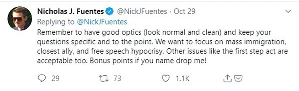 Am Dienstagabend fand eine Veranstaltung der TPUSA, im Rahmen einer „Culture War“-Reihe an der Ohio State Universität statt. Auf der Bühne saßen Kirk Foster Friess und Rob Smith, ein schwarzer konservativer Kriegsveteran. Im Vorfeld hatte Nick Fuentes dazu aufgerufen das Event zu stören. Er schrieb dazu auf Twitter: „Wir müssen unsere Kampagne auf das nächste Level bringen auf diesem Event.“ Er feuerte seine Gefolgsleute an, während des Q&A-Teils spezielle Fragen zu stellen. Außerdem ermahnte Fuentes seine Anhänger „normal und sauber“ auszusehen.