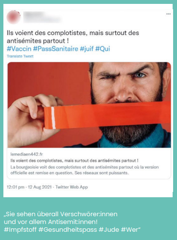 Dieser Abschnitt konzentriert sich zwar auf frankophone belgische Impfgegner:innenNetzwerke auf Facebook und Twitter, aber aufgrund der gemeinsamen Sprache war es manchmal schwierig, zwischen in Frankreich und in Belgien lebenden Nutzer:innen zu unterscheiden. Die öffentlichen Debatten in Frankreich, darunter jene über die Impfstoffe und den Gesundheitspass, haben auch einen großen Einfluss auf Belgien. Facebook hat strenge Gemeinschaftsstandards für die Entfernung von Hass, Holocaust-Leugnung und COVID-19-relevanten Fehlinformationen eingeführt, aber diese Art von Inhalten ist immer noch auf der Plattform präsent – vor allem in Kommentaren, hasserfüllter Rhetorik, die verschleiert wird, um die Moderation zu umgehen, und in privaten Gruppen. Wenn sie privat sind, sind Gruppen selbstmoderierte Diskussionsforen, in denen die Administrator:innen das Recht haben, zu moderieren und Personen zuzulassen, die beitreten und die Beiträge sehen wollen. Sie fungieren als Echokammern, in denen Nutzer:innen mit ähnlichen Ansichten den Zugang zu unterschiedlichen Perspektiven einschränken und die Verschwörungs- und hasserfüllten Ideologien, an die sie glauben, verstärken. Diese Gruppen normalisieren nicht nur den Hass, sondern haben auch das Potenzial, Menschen zu extremeren Ideologien und einer rechtsextremen Radikalisierung zu führen. Aufgrund der Tatsache, dass viele Gruppen von Impfgegner:innen auf Facebook privat und daher nicht leicht zugänglich waren, konzentrierte sich diese Untersuchung über Wallonien und das frankophone Belgien hauptsächlich auf Twitter. Der Großteil der antisemitischen Sprache und Klischees, die in den Inhalten von Impfgegner:innen auf Twitter identifiziert wurden, bezieht sich auf das oben genannte Narrativ, in der Regel mit sehr wenig Text und Hashtags, die ein Bild oder Video kommentieren. Insgesamt werden diese Narrative von gewöhnlichen Nutzer:innen geteilt und verbreitet und nicht von Influencer:innen, bekannten Persönlichkeiten oder Politiker:innen.