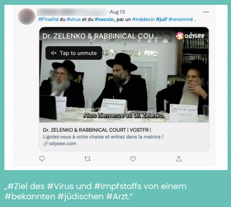 Die Pandemie hat einen Boom an antisemitischen Verschwörungsideologien ausgelöst, die Juden:Jüdinnen explizit oder implizit als die Verschwörer:innen in finsteren Plänen identifizieren, um finanziellen Profit und Macht aus der Pandemie und den Maßnahmen zu ihrer Bekämpfung zu ziehen. In Belgien ist eines der bekanntesten hasserfüllten Narrative, das unter COVID-19-Leugner:innen und Impfgegner:innen an Popularität gewonnen hat, die „Neue Weltordnung“ (NWO), eine klassische Verschwörungsideologie, die in verschiedenen Varianten immer wieder neue Formen annimmt. Die NWO überschneidet sich mit der neuesten Version des „Großen Neustarts“ und behauptet, dass eine geheime globale Elite das Weltgeschehen kontrolliert und ein globales totalitäres Regime errichten will, in dem die Menschen versklavt werden. Angepasst an die Umstände der COVID-19-Pandemie behauptet diese Verschwörungsideologie, dass COVID-19 geschaffen wurde, um die Bevölkerung des Planeten dramatisch zu reduzieren und autoritäre Maßnahmen durchzusetzen. Oft versteckt hinter einer verschlüsselten Sprache, ist Antisemitismus ein wesentlicher Bestandteil dieser Verschwörungsideologie. Hinter Verweisen auf George Soros, die Rothschilds und die Rockefellers als Drahtzieher des Weltgeschehens sowie Begriffen wie „Banker“, „Puppenspieler“ und „intrigante Eliten“ – eine Chiffre für Juden:Jüdinnen – verbergen sich antisemitische Klischees jüdischer Herrschaft und Kontrolle. Zu den beliebten Hashtags im Zusammenhang mit dieser Verschwörungsideologie gehören #NousSavons (#WirWissenBescheid) und #Qui (#Wer). Mit ersterem behaupten die Nutzer:innen, dass sie wissen, dass Impfstoffe unwirksam/schädlich/tödlich sind, dass sie eingesetzt werden, um die Weltbevölkerung zu dezimieren, und dass es sich um ein Komplott einer geheimen Elite handelt. Der andere Hashtag, #Qui (#Wer), wird verwendet, um auf jüdische Personen anzuspielen, die den Finanz-, Politik- und Mediensektor kontrollieren. Er entstand im Sommer in Frankreich, verbreitete sich aber sofort auch in Belgien. „Wer“ stammt aus einem Interview mit dem pensionierten Armeegeneral Daniel Delawarde auf dem französischen Sender CNEWS im Juni 2021. Während der Sendung deutete Delawarde an, dass eine „bestimmte Gruppe“ die Medien kontrolliert. Als der:die Journalist:in ihn fragte, auf wen er sich beziehe, antwortete er: „Die Gemeinschaft, die Sie gut kennen. Ohne es ausdrücklich zu sagen, beschuldigte der ehemalige General die Juden:Jüdinnen, den Mediensektor zu dominieren. Mit dem Begriff #Qui, auf Online-Posts und Plakaten bei Straßendemonstrationen, verweisen die Impfgegner:innen auf Juden:Jüdinnen und ihre Kontrolle über die Pandemie durch ihre Dominanz in Schlüsselsektoren.