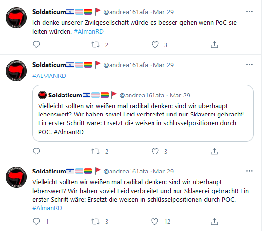 Um dies überzeugend zu erreichen, wurde dazu aufgerufen, sich als „Linke” zu tarnen – jedoch nur mäßig erfolgreich. Dass zahlreiche an der Kampagne beteiligte Accounts nur wenige Stunden oder Tage alt waren, ausschließlich Tweets zu #AlmanRD veröffentlicht hatten, oder dass Accounts mit Regenbogenfahne im Namen und #BlackLivesMatter in der Twitter-Biographie einige Tage zuvor noch Compact-Artikel gepostet hatten, macht für halbwegs Twitter-erfahrene User*innen deutlich, dass es sich um Fake-Profile handeln muss. Auch entlarvt die verwendete Sprache oft, dass die Aktivist*innen keinen eigenen Zugang zu antifaschistischer oder antirassistischer Rhetorik haben, sondern diese lediglich imitieren: