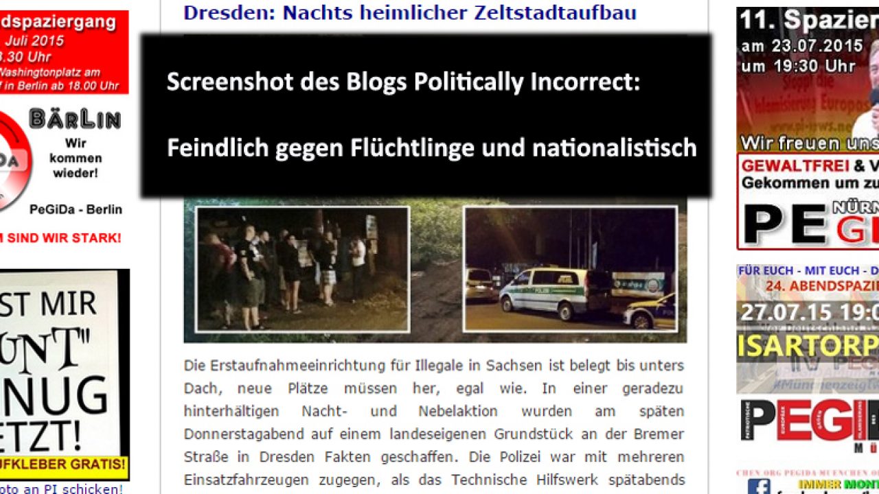 Aktuelle Titelseite des islamfeindlichen Blogs "Politically Incorrect" (auch PI-News genannt) mit einer "schönen" Mischung aus Pegida, Rassismus und Hetze gegen Flüchtlinge. PI-News ist eine Vervielfältigungsmaschine für rechtspopulistischen Hass seit 2004, und eine sehr beliebte: Der Blog ist seit Jahren immer in den Top 20 der deutschen Blogcharts. (Quelle: Screenshot 24.07.2015)