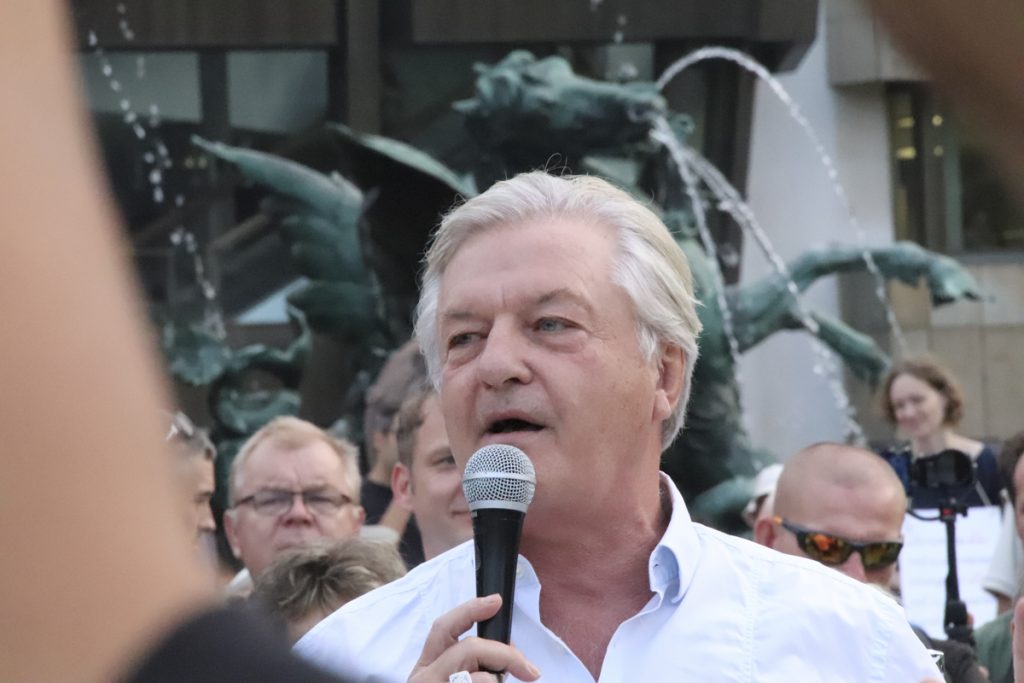 Immer wieder forderte er eine Querfront zwischen den Teilnehmer*innen der rechtsextremen Kundgebung und der Linkspartei.