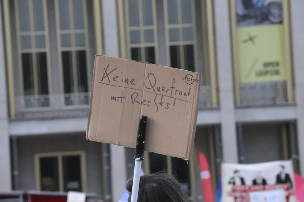 Eine Querfront, ein Schulterschluss beider politischen Lager, rechts und links, ist am Montag nicht entstanden. Obwohl Jürgen Elsässer in seiner Rede auf dem Augustusplatz immer wieder die Notwendigkeit einer Querfront betonte und das Publikum zwar auch johlte, schien der tatsächliche Wille der Demonstrierenden eher gering, in einen Austausch mit den Gegendemonstrant*innen zu treten, oder gar auf die andere Kundgebung zu gehen.