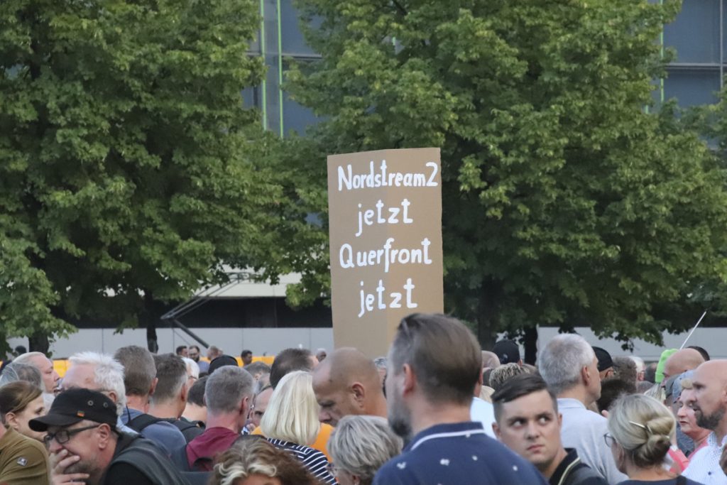 Die frühere Fraktionschefin, Sahra Wagenknecht, wurde von der Linken-Demonstration im Vorfeld zunächst ein- und dann wieder ausgeladen. Elsässer bot der sehr problematischen Politikerin an, dass sie auf der Bühne der „Freien Sachsen“ immer willkommen sei. Schließlich stimmte er „Sahra, Sahra“-Rufe an. Die Menge rief mit.