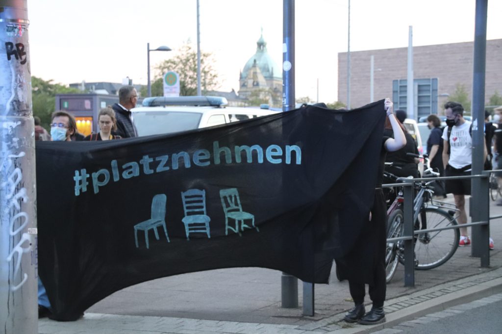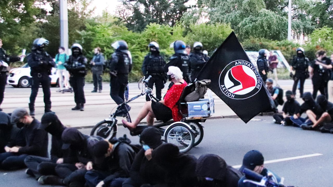 Am Rande dieses kläglichen Rückzugs der Rechtsextremen standen vereinzelte linke Aktivist*innen in vermeintlich sicherem Abstand.