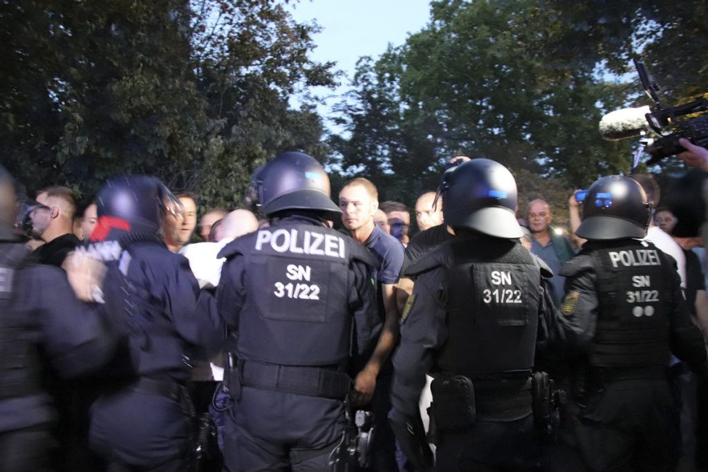 Vom Beginn eines Systemsturzes war die Veranstaltung der „Freien Sachsen“ jedoch ganz weit entfernt. Dafür war das Gewaltpotential der rechtsextremen Kundgebung recht hoch. Immer wieder kam es am Rande zu Übergriffen auf Journalist*innen, Gegendemonstrant*innen und Polizist*innen.