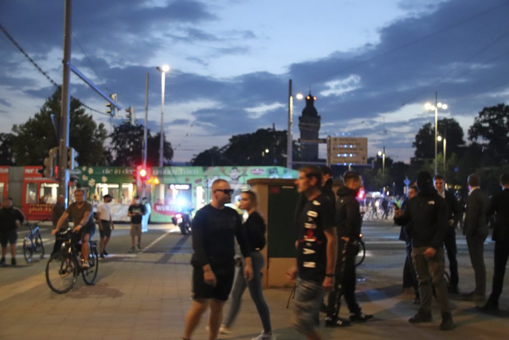 Sichtlich frustriert, dass die Revolution schon wieder nicht begonnen hat, die Querfront mit der Linkspartei nicht gefruchtet hat und dass die Demokratiefeinde daran gehindert wurden, im Kreis zu laufen, weil ein paar Menschen auf dem Boden sitzen, drehten immer mehr Menschen um, zurück zum Augustusplatz – ohne Polizeibegleitung. Rund 550 Polizeibeamte waren am Montag in Leipzig im Einsatz, um die insgesamt sieben angemeldeten Kundgebungen zu sichern.
