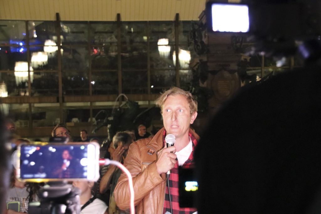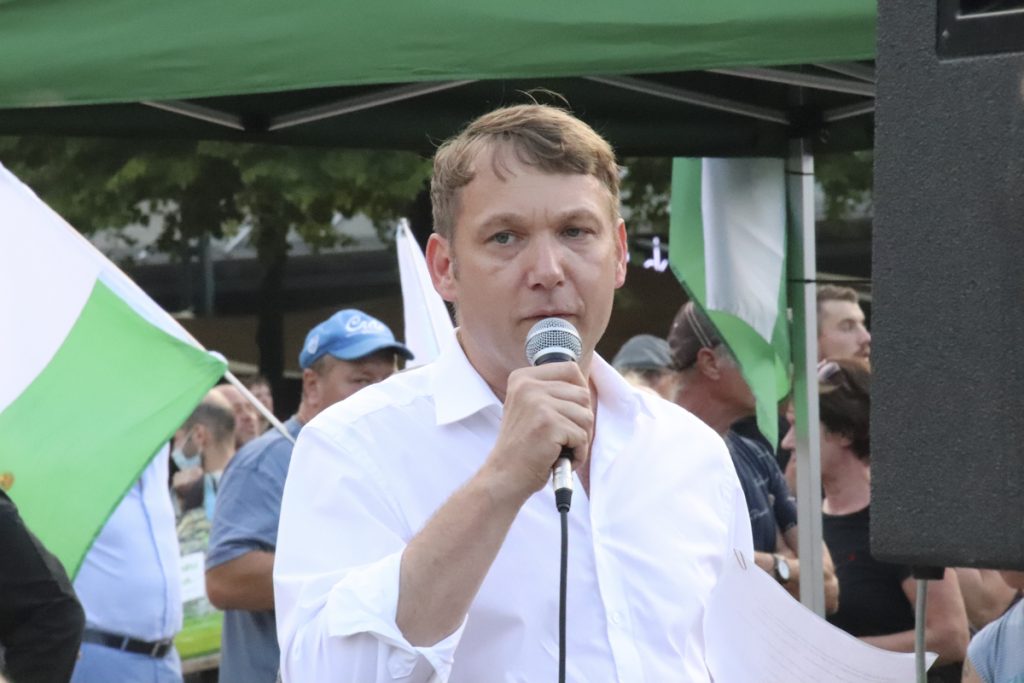 Als die rechten Teilnehmer*innen schließlich zurück am Augustusplatz waren, durfte Anselm Lenz eine Rede halten. Lenz ist Mitbegründer der Berliner „Hygiene Demos“. Er und die rechtsextreme Szene bezeichnen ihn als links. Er, der auf einer rechtsextremen Veranstaltung spricht, nennt hingegen die Linkspartei zum Ende der Kundgebung „gefälschte Linke“.