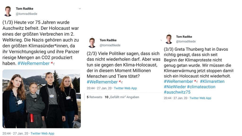 Dem ganzen die Krone aufgesetzt hat allerdings ausgerechnet ein Nachwuchspolitiker der Linken in Hamburg. Der 18-jährige „Fridays for Future“-Aktivist Tom Radtke postete drei Tweets mit so unglaublichem Inhalt, dass Twitter-User*innen zunächst von einem Fake-Account ausgingen. „Die Nazis gehören auch zu den größten Klimasünder*innen, da ihr Vernichtungskrieg und ihre Panzer riesige Mengen an CO2 produziert haben“. Danach schreibt Radtke über den „Klima-Holocaust, der in diesem Moment Millionen Menschen und Tiere tötet,“ In einem dritten Tweet heißt es: „Wir müssen die Klimaerwärmung jetzt stoppen damit sich ein Holocaust nicht wiederholt,“ danach der Hashtag #weremember. Und als ob das alles noch nicht genug wäre, benutzt Radtke dann auch noch ein Bild vom Weltwirtschaftsforum in Davos, auf dem Greta Thunberg mit drei anderen Aktivist*innen zu sehen ist. Ausgerechnet dieses Bild wurde von der Fotoagentur so beschnitten, dass die ugandische Klima-Aktivistin Vanessa Nakate, die einzige schwarze Person auf dem ursprünglichen Bild, nicht mehr zu sehen ist.