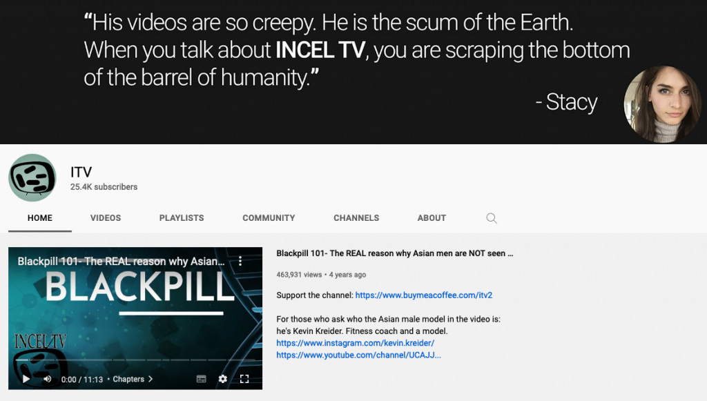 Ein Forschungsaspekt der Studie war die Verbreitung von Incel-Inhalten auf der Plattform YouTube. Wie Recherchen innerhalb der Incel-Community ergeben haben, spielt die Videoplattform für viele Incels eine große Rolle dabei, die sogenannte „Blackpill“-Ideologie zu internalisieren. Zahlreiche Postings auf dem größten Incel-Forum verweisen auf spezifische „Content Creator“ aus der Szene, die Incels in ihrer verzerrten und frauenfeindlichen Weltsicht bestätigen. Neben Incel-Musikern, über die Belltower.News bereits berichtet hat, gibt es mehrere Kanäle, deren Betreiber sich zur Aufgabe gemacht haben, anhand von Videos die „Blackpill“ zu verbreiten.