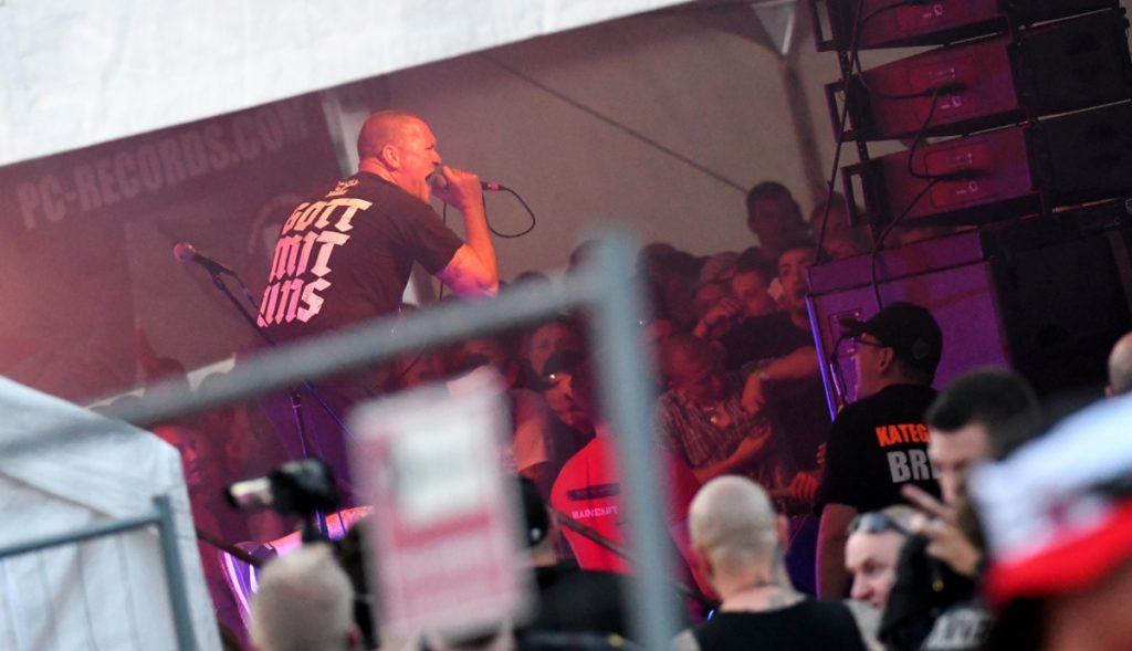 Am gleichen Tag wurde hunderte Kilometer südlich, im baden-württembergischen Waldbronn/Neurod, auch das Konzert einer weiteren Bremer Rechtsrockband polizeilich aufgelöst. Dabei handelte es sich um ein Konzert der Band „Kategorie C / Hungrige Wölfe“, welches im Vorfeld als offizielles Abschiedskonzert der Band beworben wurde. Ursprünglich sollte die Veranstaltung in Rastatt/Bentheim stattfinden, um dann kurzfristig nach Neurod verlegt zu werden. Nachdem das Konzert bei den Betreiber*innen des Veranstaltungsortes unter falschen Angaben angemeldet wurde und sich diese beim Anblick der etwa 150 Konzertbesucher*innen getäuscht sahen, wurde das Konzert gegen 22:30 Uhr durch die kurzfristig zusammengezogenen Polizeikräfte aufgelöst. Ihre Auflösung als Band hatte „Kategorie C“ (KC) um ihren Sänger Hannes Ostendorf bereits im Zusammenhang mit einem Rechtsrockfestivals im sächsischen Ostritz im Juni 2019 bekannt gegeben. Inwieweit diese Auflösung Bestand haben wird oder es zu einem „Rücktritt vom Rücktritt“ kommen wird, bleibt abzuwarten. Auch abseits von „Kategorie C“ dürfte deren Sänger Hannes Ostendorf auch weiterhin wesentlicher Bestandteil der internationalen Rechtsrockszene bleiben. So auch als Sänger der Band „Nahkampf“: Die 1988 ebenfalls in Bremen gegründete Rechtsrockgruppe, welche im Jahr 2018 ihr letztes Album veröffentlichte, wird von Beobachter*innen dem Netzwerk von Blood & Honour zugerechnet. Gemeinsam mit Achim Buonafede, bekennender Faschist und Führungsperson der Neonazigruppe „Berserker Wolfsburg“, veröffentlichte Hannes Ostendorf ebenfalls im Jahr 2019 eine Soli-CD für krebskranke Kinder. Bei den Empfänger*innen der damit erzielten Einnahmen handelte es sich im Wesentlichen um Anhänger*innen der extremen Rechten. Neben seinen Aktivitäten als Sänger von Rechtsrockbands tritt der Bruder des Bremer Neonazifunktionärs Henrik Ostendorf auch als Liedermacher in Erscheinung, so unter anderem im November 2019 bei Konzerten in Sachsen und Thüringen.