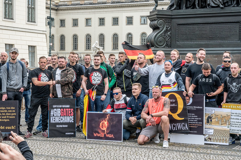 Schon zu Beginn der Proteste zeigte gerade die rechtspopulistische Szene großes Interesse an den beginnenden Versammlungen und warb in ihren Kanälen um Teilnahme. Getragen wurden diese Gruppierungen aber nach außen eher von vorher unbekannten Akteuren. Bei manchen ließ sich allerdings anhand von Facebook-Postings nachzeichnen, wie nach eher bürgerlichen, gelegentlich auch linken Themen, nach und nach rechte Youtuber*innen und Verschwörungserzählungen Einzug hielten. Wer voreingenommen nach einer Bestätigung für seine ablehnende Haltung gegen die Anti-Corona-Maßnahmen suchte, fand sie etwa bei Ken Jebsen und anderen. Die Corona-Proteste vereinigten auch schon früh verschiedene „Anti-Gruppen“, etwa Impfgegner*innen und Gegner*innen des Mobilfunkstandards 5G. In Landshut beispielsweise sprach im September eine Vertreterin der „Initiative gegen Kinderrechte im Grundgesetz“ aus dem Umfeld der homophoben „Demo für alle“. Gemeinsamer Nenner: „Der Staat impft und frühsexualisiert eure Kinder“. Von Beginn an sichtbar waren Anhänger*innen des „QAnon“-Kultes.