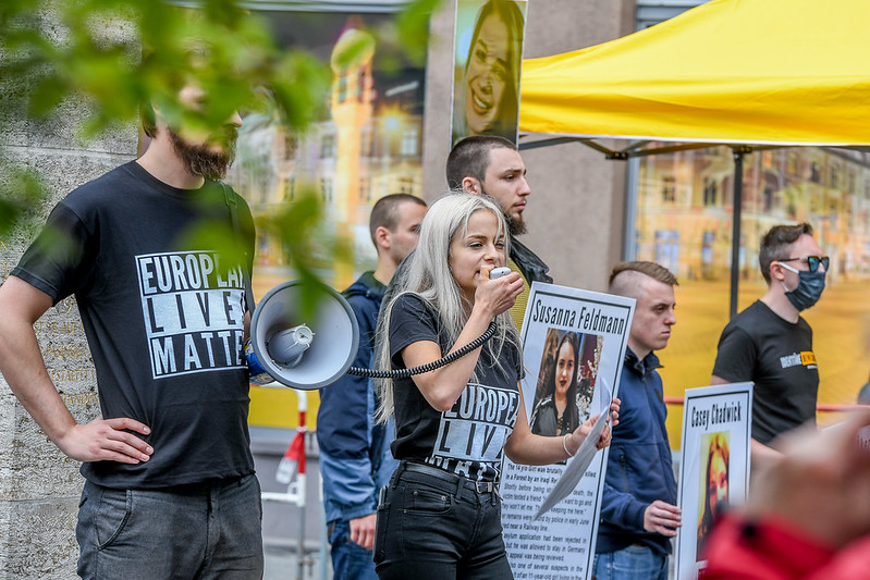 Wichtiger innerhalb der unbedeutender werdenden Strukturen der „Identitären Bewegung“ (IB) werden deren Aktivist*innen in Bayern. Sie beteiligen sich weiterhin rege an den bundesdeutschen Kampagnen, etwa der Straßenbüro-Tour, auch wenn die örtlich soweit beobachtbar auf wenig Resonanz stieß. Als Antwort auf die große „Black-Lives-Matter“-Kundgebung mit 25.000 Teilnehmer*innen versuchte sich die IB an einer Gegen-Mahnwache. Auch bei der Aktion gegen das Gewerkschaftshaus in Stuttgart oder bei Demos in Wien waren bayerische IB-Leute vor Ort. Die Aktivistin Annie Hunnecke wird zunehmend zum Werbegesicht der deutschen IB.