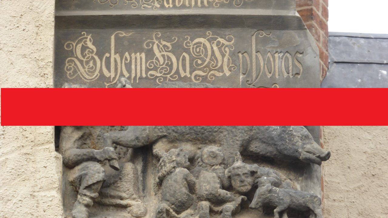 Das Sandsteinrelief an der Wittenberger Stadtkirche St. Marien zeigt eine Sau und vier menschliche Figuren, die an ihren Zitzen saugen und ihren Schwanz anheben, um ihren After zu betrachten. Die Menschen sind durch ihre spitzen Hüte als jüdisch markiert. Durch die Überschrift „Rabini Schem HaMphoras“, die Bezug auf einen jüdischen Gottesnamen nimmt, wird die Verbindung zwischen dem Schwein und dem Judentum noch zusätzlich verdeutlicht. Die Plastik entstand gegen Ende des 13. Jahrhunderts und befand sich zunächst im Altarraum der Kirche. Der Reformator Martin Luther, der selbst in der Stadtkirche predigte, hatte sie in seiner judenfeindlichen Schmähschrift „Vom Schem Hamphoras“ von 1543 bekannt gemacht, woraufhin sie an die Außenfassade der Kirche versetzt und mit der neuen Überschrift versehen wurde.