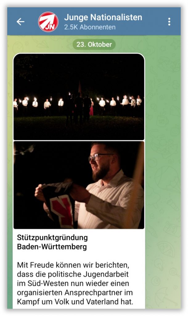 Die JN titelten den Beitrag „Stützpunktgründung Baden-Württemberg“ und schrieben: „Mit Freude können wir berichten, dass die politische Jugendarbeit im Süd-Westen nun wieder einen organisierten Ansprechpartner im Kampf um Volk und Vaterland hat.“ Offenbar versuchen die JN mit einigen Vollmitgliedern aus dem Nordosten Baden-Württembergs, die brachliegenden Strukturen der NPD-Jugendorganisation im Bundesland zu reaktivieren und neu zu strukturieren. Schließlich hatten die JN Heilbronn-Hohenlohe ihre Aktivitäten vor ein paar Jahren eingestellt.