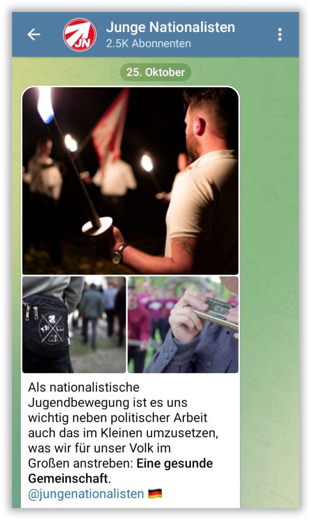 Einen Tag später, am 24. Oktober 2022, veröffentlichten die JN einen Bericht und einige Fotos zur Veranstaltung im „Jugendheim Hohenlohe“ (siehe Abbildung 2). Die Veröffentlichungen geben Einblicke in das Programm des „Gemeinschaftstag Süd“. Der Samstag, 15. Oktober 2022, begann mit Frühsport. Im Fokus des Tages standen ideologische Schulungen. Es wurden Vorträge zur Bedeutung und Pflege vom Brauchtum sowie zur Funktion und Rolle von Musik gehalten. Gemeinsames Musizieren und Zimmermannsklatschen knüpften an die Vortragsthemen an. Am Samstagnachmittag besichtigten die Neonazis ein Schloss in der Region. Es heißt im Bericht: „Nach dem Mittagessen und einer kleinen Pause haben wir an einer Führung durch ein über 500 Jahre altes Schloss teilgenommen, in welchem uns der geschichtliche Hintergrund erklärt und gezeigt wurde. Anschließend haben wir die Grundmauern der alten Wasserburg besichtigt.“