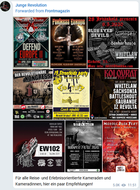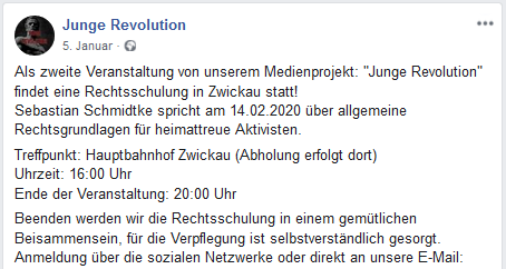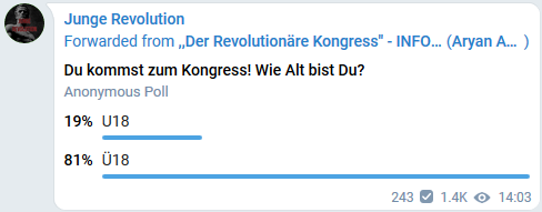 Von sich selbst behauptet die Gruppe, ein „ergänzendes Bindeglied“ in der rechtsextremen Szene darzustellen. Passend dazu wird seit November 2019 auf den verschiedenen Kanälen eine Veranstaltung mit dem Namen „Revolutionärer Kongress“ beworben. Dieser soll am 14.03.2020 in Zobes (Sachsen) stattfinden und ein Anlaufpunkt für rechtsextreme Jugendliche sein, um Kontakte zu Parteien oder anderen Organisationen zu knüpfen und sich weitergehend in der Szene zu betätigen. Für Teilnehmer*innen bis 18 Jahre ist der Eintritt frei – die Suche nach rechtsextremem Nachwuchs scheint dringlich zu sein. In einer Umfrage auf dem Telegram-Kanal der Gruppe wird jedoch deutlich, dass die Jugendlichen dort eher in der Minderheit sein werden.