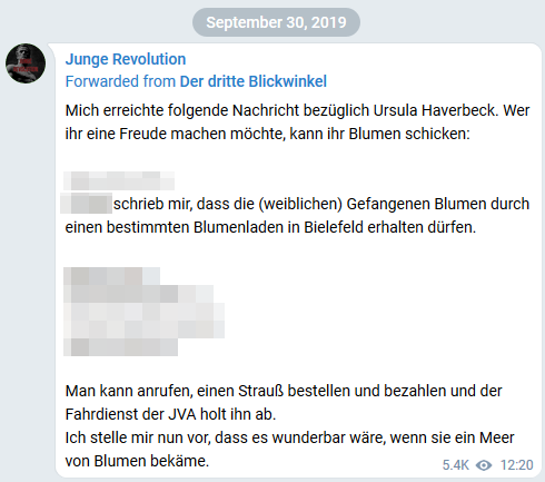 Außerdem werden Spendenaufrufe anderer Projekte der Szene geteilt, rechtsextreme Publikationen wie „N.S. Heute“ beworben und zur Unterstützung für die Holocaust-Leugnerin Ursula Haverbeck aufgerufen: