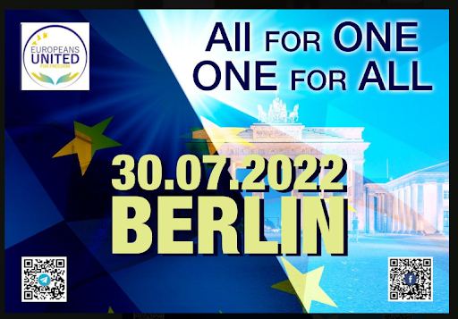 Mit den „Europeans United“, einer weitestgehend gesichtslosen Social-Media-Mobilisierungsgruppe, ruft er übrigens auch nach Berlin auf, dann aber am 30.07.2022, dann wieder mit einem andeutungsvoll an QAnon angelehnten Demonstrationsmotto „All for one and one for all“.
