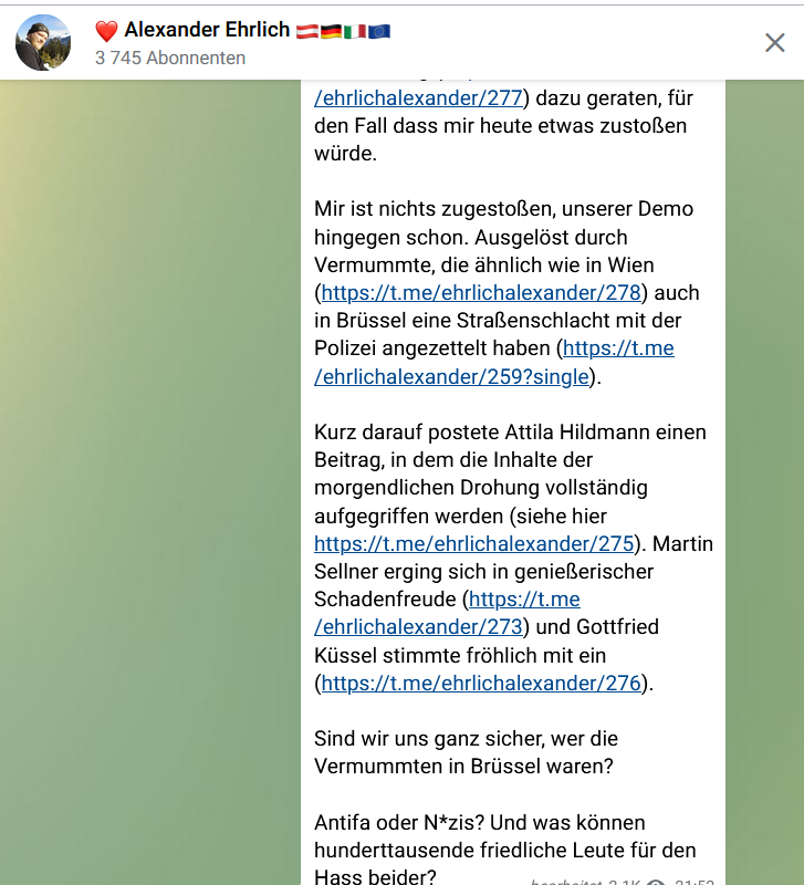 Die Gewalteskalation in Brüssel am 23.01.2022 schmerzt Alexander Ehrlich. Sagt er. Immerhin sieht der 41-Jährige sich selbst als „Friedensaktivisten“, der – diesmal unter dem Label „Europeans United“ – den „March for Freedom, Democracy and Human Rights“ am 23.01.2022 mit organisiert hat, wie er selbst in Telegram-Videos erzählt. Und „99,9 Prozent“ der Veranstaltung seien auch „absolut friedlich“ gewesen. Aber dann waren da die „200 bis 300 schwarz vermummten Provokateure“, die Krawall gemacht hätten, „damit die Medien ihre Bilder bekommen“. Das klingt wie „Willkommen in der Welt der Verschwörungserzählungen“, aber Ehrlich meint (diesmal) gar nicht, dass es staatlich bezahlte Provokateure gewesen seien. Er dachte an gewalttätige Antifa-Provokationsgruppen, aber seit rechtsextreme Akteure wie Martin Sellner ihm vorwerfen, Antifa-Gruppen auf die Demonstration mit eingeladen zu haben, fragt Ehrlich sich doch, ob es nicht „Nazis“ gewesen sein könnten.