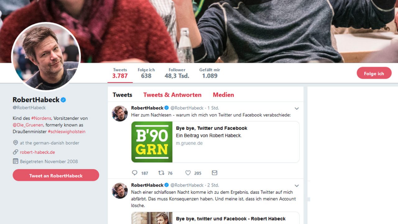 Natürlich hat sich nicht die Grüne Partei aus dem Internet verabschiedet, es ist nur ihr Vorsitzender Robert Habeck, der auf einem Blog-Beitrag seine Gründe dafür beschreibt, warum er sein Twitter und sein Facebook-Konto löscht. Er reflektiert seine Twitter-Nutzung, fühlt sich vom Medium zu Verkürzung getriggert und kündigt an, Social Media-Netzwerke zu verlassen. Persönlich ist es eine verständliche Entscheidung, vom Meinungssturm des Internets eine Pause zu brauchen. Denkbar wäre aber auch eine geänderte Nutzung, wie ein Vier-Augen-Prinzip auch für persönliche Tweets, Abnahme von Videos durch eine unabhängige Person oder Ähnliches.