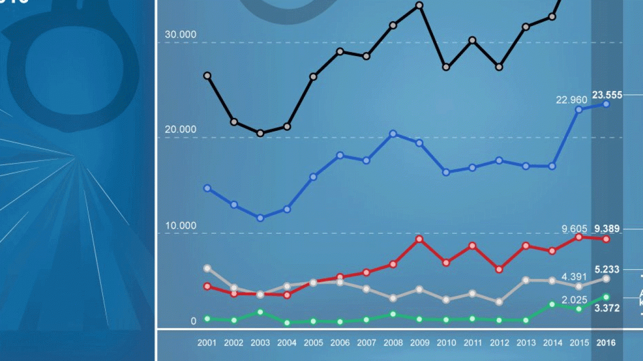 Die Zahl der Straftaten mit politischem Hintergrund ist im Jahr 2016 erneut gestiegen und hat einen neuen Höchststand erreicht, verantwortlich sind meist rechtsradikale Täter. Insgesamt wurden 41.549 Straftaten (+6,6 Prozent zum Vorjahr) und 4.311 Gewalttaten (-2,1 Prozent) registriert.