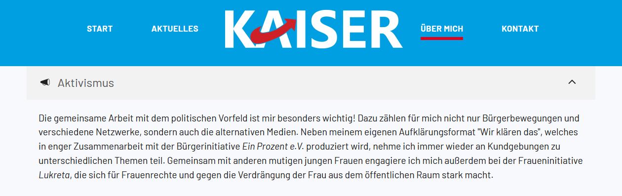 Dabei steht sie dem Konzept der “gemäßigten” AfD diametral entgegen: Sie pflegt intensive Kontakte etwa zum rechtsextremen Compact-Magazin, dessen Inhalte sie auch gern verbreitet und teilt, und zur sogenannten “Neuen Rechten” um Verleger Götz Kubitschek in Schnellroda. Intensiv ist der Kontakt mit der IB-nahen Organisation “Ein Prozent”. Mit “Ein Prozent” produziert sie auch eine Video-Serie namens “Wir klären das” als Replik auf Formate von funk aus dem öffentlich-rechtlichen Rundfunk. Die Serie wird derzeit auf Hagen Grells rechtsalternativer Videoplattform “Frei3” veröffentlicht, aber weil sie dort kaum Reichweite bekommt, vor allem über Telegram gepusht. Kaiser engagiert sich, wie sie selbst in ihrer Vita schreibt, auch in der rechtsextremen Fraueninitiatve “Lukreta”, in der vor allem Aktivist*innen der „Identitären Bewegung“ zusammenkommen. Marie-Thérèse Kaiser ist also zumindest offen rechtsradikal interessiert – dahingehen können wir Stefan Marzischewski-Drewes weiterhelfen. Weil sie selbst durch ihren Ehrgeiz bereits angeeckt ist, der nicht zum rechtsradikalen Frauenbild passt, präsentiert sie sich im Wahlkampf sehr traditionell. Einsetzen will sie sich für „Stärkung des traditionellen Familienbildes zum Selbsterhalt des deutschen Volkes; natürliche Geschlechterunterschiede wertschätzen und individuell fördern; gesellschaftlichen Druck auf Hausfrauen beenden, Tätigkeit für die Familie wertschätzen…“, garniert mit Islamfeindlichkeit und Flüchtlingsfeindlichkeit.