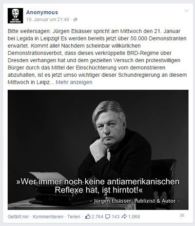 Wie entsprechende verschwörungstheoretisch-antiamerikanische „Argumentationen“ funktionieren, lässt sich übrigens am besten auf der größten deutschen „Anonymous“-Seite verfolgen, die von neurechten Kräften gekapert wurde, um ihre Sicht der Welt zu verbreiten und seitdem besonders vom Querfront-Spektrum frequentiert wird. Erschreckenderweise hat sie auf Facebook immer noch über 670.000 Fans, obwohl dort etwa aktuell offen über Geschichtsfälschung und Denkverbote schwadroniert wird, sinkende Absatzzahlen der auch so benannten „Lügenpresse“ bejubelt und der Auftritt des Querfront-Rechten Jürgen Elsässers bei der „Legida“-Demonstration heute Abend beworben wird. Hier wurde etwa auch erklärt, warum „Pegida“ eigentlich von den USA gelenkt ist: Lutz Bachmann habe einen amerikanischen Pass, ein antiamerikanisches Plakat wurde nicht auf die Bühne gelassen und CNN bekam ein Interview. Alles klar? Manchen Menschen offenbar schon (mehr zu den Verschwörungstheorien etwa zu Charlie Hebdo berichtet das Vice-Magazin). Natürlich wird hier auch „Pegada“ beziehungsweise „EnDgAmE“ beworben.