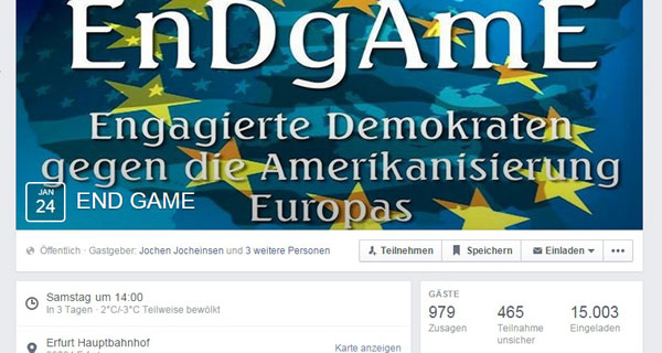 Wer nun vielleicht meint, solcher Blödsinn könne nur im Internet funktionieren: „EnDgAmE“ will am Samstag in Erfurt auf die Straße gehen. Eine Demonstration durch die Innenstadt ist ab 14 Uhr angemeldet – und sie wird auch schon fleißig beworben: Und zwar von von militanten Hooligan-Kreise der „Hogesa“ und Neonazis aus Thüringen. Unter dem Motto „Engagierte Demokraten gegen die Amerikanisierung Europas“ sind mehrere Redner angekündigt – eben Stephane Simon – explizist angekündigt als „unzensiert“ -, der Erfurter Montagsmahnwachen-Aktivist Konstantin Stößel und Viktor Seibel, der laut „tlz“ im Dezember zur „Kagida“-Kundgebung in Kassel über „die deutsche nationale Problematik“ eine Rede gehalten hat. 15.000 Menschen haben die Organisatoren über Facebook eingeladen – zugesagt haben auch schon erstaunliche 1.000 Menschen.