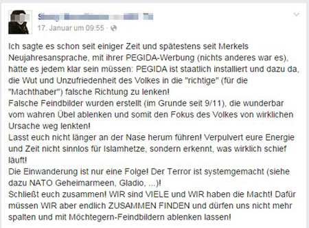 Screenshot eines Postings einer Admin aus einer „Pegada“-Facebook-Gruppe,der erklärt, wie die imaginierte „staatliche Lenkung“ von „Pegida“ funktioniert.