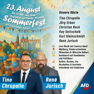 Erst am Sonntag veröffentlichte das rechtsextreme Compact-Magazin (Sitz in Sachsen-Anhalt) von Jürgen Elsässer (aus Baden-Württemberg) ein Propaganda-Video für Jurisch. Auf Jurischs “Sommerfest” in Meißen war unter anderem Parteichef Tino Chrupalla anwesend. Der kommt immerhin aus demselben Bundesland wie Jurisch und ist damit fast schon Exot innerhalb der hochprofessionellen bundesweiten Kampagne, die den Menschen in Meißen erklären soll, wen sie bitteschön zu wählen haben.