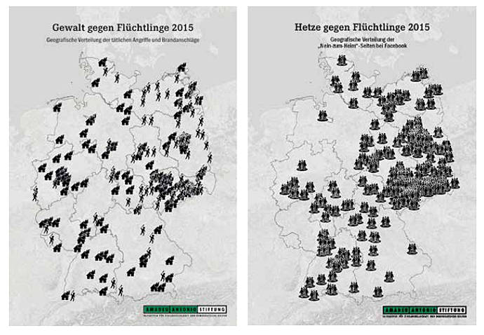 Links: Regionale Verteilung von Gewalt gegen Geflüchtete im wirklichen Leben; rechts: „Nein zum Heim“-Gruppen in Sozialen Netzwerken -> Kein 1:1-Verhältnis, aber wechselseitige Befeuerung.