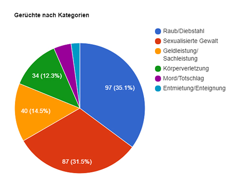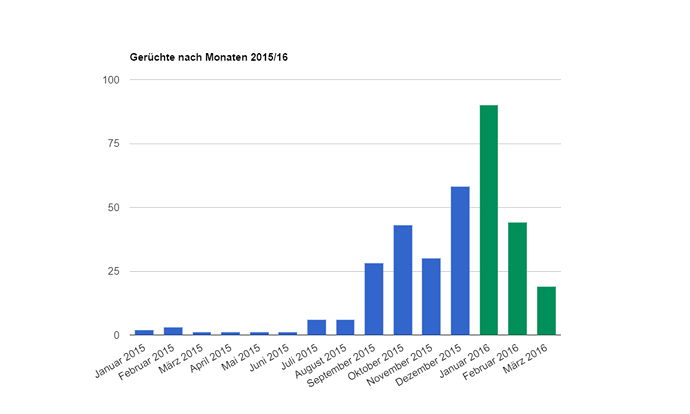 Drei Zäsurpunkte sind in der zahlenmäßigen Entwicklung der verbreiteten Gerüchte auszumachen. Im Sommer 2015 wuchs mit der Ankunft zahlreicher Flüchtlinge auch die Zahl der Gerüchte sprunghaft von nur 6 im Juli und August zu 28 Gerüchten im September und 43 im Oktober an. Während für Dezember 58 Gerüchte auf der Karte zu finden sind, waren es im Januar dann 90. Diese massive Steigerung im Januar 2016 ist vermutlich auf die Vorkommnisse während der Silvesternacht in Köln zurückzuführen. Im Anschluss an die Schließung der Balkanroute im März 2016 und die damit verbundene deutliche Verringerung der Zahl neu ankommender Geflüchteter sank die Zahl der Gerüchte von 44 im Februar auf zuletzt 19 im März.