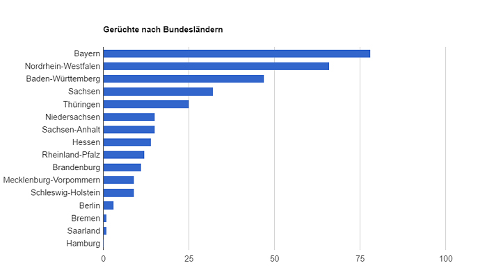 Populäre Beispiele für solche Falschmeldungen sind Vergewaltigungen, ungeahndete Diebstähle in Supermärkten und massive Ausgaben für teure Gebrauchsgegenstände. Einen Überblick zu Falschmeldungen und deren Verbreitung bietet das Projekt hoaxmap.org. Eine Auswertung der von Hoaxmap erhobenen Daten zeigt, dass für die Jahre 2015 und 2016 aktuell 337 Gerüchte über Geflüchtete im Netz verbreitet werden. Nach Bundesländern aufgeteilt finden sich die meisten Gerüchte in Bayern (78), gefolgt von Nordrhein-Westfalen (66), Baden-Württemberg (47), Sachsen (32) und Thüringen (25). Als mögliche Erklärung für die Vielzahl der Falschmeldungen in Bayern wäre zu nennen, dass eine Vielzahl der Geflüchteten, die über die Balkanroute nach Deutschland kamen, zunächst über die bayerische Grenze einreisten. Nordrhein-Westfalen wie auch Baden-Württemberg und Bayern sind zudem die Bundesländer, die bundesweit die höchste Anzahl an Erstanträgen auf Asyl zu verzeichnen haben. In Sachsen und Thüringen haben sich in den vergangenen Jahren große islam- und asylfeindliche Bewegungen etabliert, die ihrerseits massiv an der digitalen Stimmungsmache beteiligt sind. Unter den Städten führen Dresden (9), Erfurt (8) und Heidelberg (6) die Rangliste an.