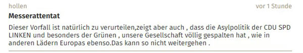 1. Mit Rassismus, denn Täter von Messerattentaten werden auch hier mit Geflüchteten gleichgesetzt2. und mit der Annahme, man wolle dem Täter als Deutschem Schuld geben.