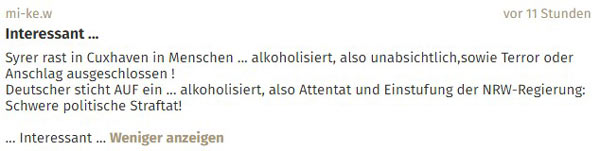 „Als rechten Vorfall hinstellen“, denn es sei ja keiner, aber das entspräche dem „Mainstream-Geschmack“. Dazu Sarkasmus gegen die Kölner Oberbürgermeisterin Henriette Reker, die auch Opfer eines Messerattentats eines Flüchtlingsfeindes geworden war, gemischt mit Häme über ihren Vorschlag angesichts von sexueller Übergriffe in der Silvesternacht. Und Schulterzucken.