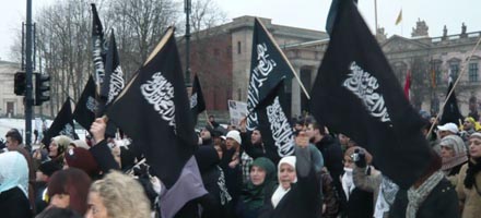 Fahnen der terroristischen Hizb ut-Tahrir in Berlin, 10.1.2009.