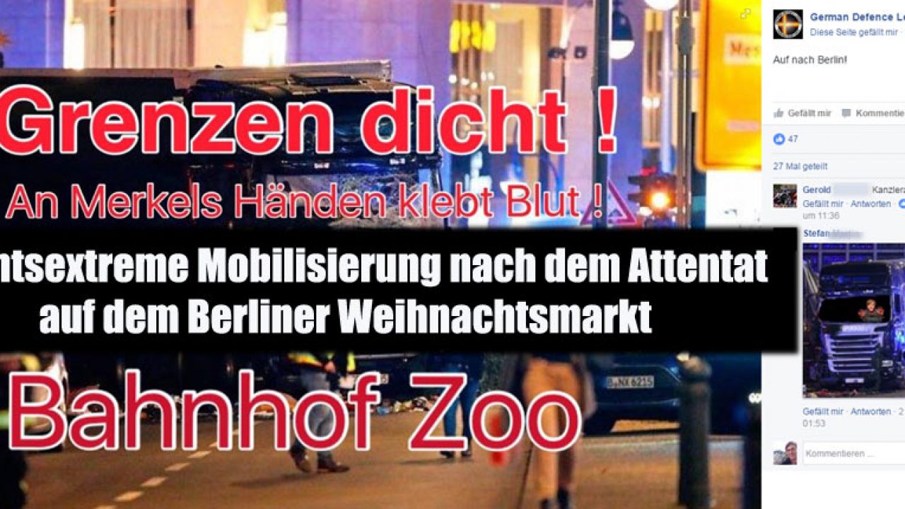 Noch bevor allerdings Fakten über den mutmaßlichen Täter bekannt wurden, begannen rechtsextreme und rechtspopulistische Kreise mit der Instrumentalisierung des Terroranschlags. Auch dies geschah in Sozialen Netzwerken wie in der Realität. Am 21.12.2016 demonstrierten in Berlin: 1. AfD-Prominenz von Björn Höcke bis Alexander Gauland, sowie die in der Szene der Neuen Rechten gefeierten Götz Kubitschek und Jürgen Elsässer, mit 150 Anhänger_innen unter dem Motto „Merkel muss weg“ (vgl. ngn). 2. NPD und „Berlin wehrt sich“ mit rund 50 Anhänger_innen. 3. Rund 30 Mitglieder der neurechten „Identitären Bewegung“, die sich vor die menschneleere CDU-Zentrale in Berlin setzten und dies als „Besetzung“ verkaufen wollten) (taz). Auch hier wurde als versucht, Diskussionen über reale Versäumnisse und Probleme mit Rassismus gegen Geflüchtete und Muslime aufzuladen – was sich auch in einer wachsenden Zahl von Bedrohungen niederschlug (taz, bento).