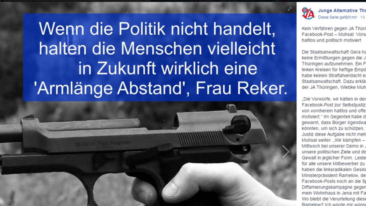 Besonders übel dabei ein Facebook-Post der Jugendorganisation der AfD, der „Jungen Alternativen Thüringen“: Die postete auf ihrer Facebook-Seite ein Foto mit einer ausgestreckten Pistole veröffentlicht. Dazu hieß es in Anspielung auf einen Ratschlag der Kölner Oberbürgermeisterin Henriette Reker: „Wenn die Politik nicht handelt, halten die Menschen vielleicht in Zukunft wirklich eine ‚Armlänge Abstand‘, Frau Reker.“ Die Landesvorsitzende der „Jungen Alternative“, die AfD-Landtagsabgeordnete Wiebke Muhsal, hatte dazu erklärt, die Empfehlung von Reker sei „eine ungeheure Dreistigkeit“. Die Distanz verkürzt hätten die Täter, nicht die sexueller Gewalt ausgesetzten Frauen: „Auch hier in Thüringen drohen uns Zustände wie in Köln und Hamburg, wenn sich die Politik nicht endlich schützend vor unseren Rechtsstaat stellt.“ Thüringens Verfassungsschutzchef Stephan Kramer bestätigte dem MDR Thüringen, dass sein Amt das Posting, dass als Aufruf zur Selbstjustiz verstanden werden kann, auf strafrechtliche Konsequenzen prüfe (Tagesspiegelmdr). Das Verfahren wurde allerdings gar nicht erst eröffnet, wie Wiebke Muhsal triumphierend auf Facebook kommentiert (siehe Titelbild). Dafür ist ihr Post ein Lehrstück in rechtspopulistischer Rhetorik: Niemals habe man zu Selbstjustiz aufrufen wollen, sondern vielmehr „warnen“, dass „Bürger“ so etwas tun könnten…
