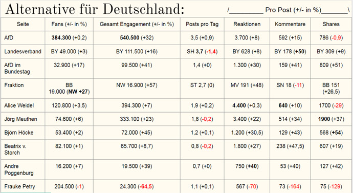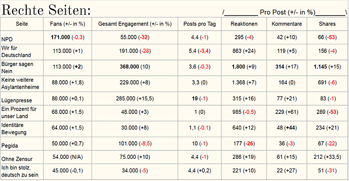 Um einen besseren Überblick über die aktuellen Entwicklung der relevanten Facebook-Seiten des rechten Spektrums auf Facebook zu geben, wird der Monitoring-Monatsrückblick um eine Übersicht der wichtigsten Daten erweitert.