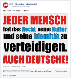 Über 9.000 Leuten gefällt das, rund 6.800 Mal wurde dieses Bild geteilt: Viele NPD-Fans fühlen sich offenkundig bedroht, müssen sich also „verteidigen“. Alles meins! Und dann wird man auch noch ständig als Deutscher beschimpft! (Werden Sie gar nicht? Wir auch nicht. Die NPD-Fans aber offenbar schon. Zumindest kommt es ihnen wohl so vor). Ob den Textern der Grafik klar ist, dass der Text im Umkehrschluss bedeutet, dass auch alle anderen Menschen das Recht haben, ihre Kultur und Identität zu „verteidigen“?