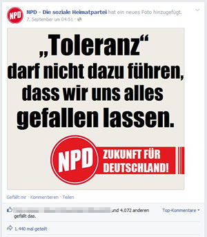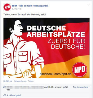 Die „Alternative für Deutschland“ ist derzeit die erfolgreichste deutsche Partei auf Facebook. Ihre Fans, so berichtete netz-gegen-nazis.de, teilen gern Grafiken mit markigen Sprüchen, kombiniert mit mehr oder weniger langen Erklärtexten, und bewegen sich thematisch im klassischen rechtspopulistischen Raum zwischen Linksextremismus- und Medienschelte bis zur Islamfeindlichkeit. Was nun mögen die 102.540 Fans, die die NPD auf Facebook hat, was teilen sie mit ihrem Umfeld, welchen Themen und Thesen stimmen sie zu?
