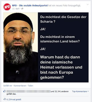 Dieses ist also das Top-Posting für NPD-Fans im ersten Halbjahr 2014. Rund 32.400 gefällt das, rund 6.200 haben es auch geteilt. Einfache, schlichte Islamfeindlichkeit mit rassistischer Note, nicht zu aggressiv, aber deutlich. Statt sich gegen den Islam zu wenden, wird allerdings geschickt das demokratiefeidliche Gesetz der Scharia angesprochen, statt „Moslems raus!“ zu schreiben, wird eine suggestive Frage gestellt, die zudem unterstellt, es gäbe keine Islamisten in Europa, sondern die seien alle „zugewandert“ und hätten noch eine „islamische Heimat“, die sie verlassen hätten. Kein Wunder, dass dieses Posting so erfolgreich war: Es verpackt Islamfeindschaft so massenkompatibel, dass es eben auf diversen privaten Pinnwänden geteilt werden kann, ohne dass der- oder diejenige allzu massiven Protest aus dem Freundeskreis erwarten müsste.