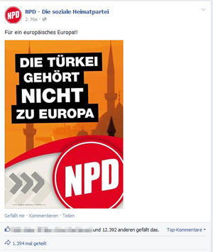 Schon wieder! Auch das zweiterfolgreichste Posting des 1. Halbjahres 2014 (rd. 12.400 gefällt es, rd. 1.400 teilen es) hat Islamfeindlichkeit und die „Festung Europa“ zum Thema. Diesmal ist das aufgehangen am EU-Beitritt der Türkei, illustriert mit Minaretten, um noch die Diskussion um den Bau von Moscheen in deutschen Innenstädten subtil noch mit einfließen zu lassen. Offensichtlich hat das Thema Islamfeindlichkeit das Zeug zum Querschnittthema nicht nur innerhalb der rechten Szene, sondern auch in die „Mehrheitsgesellschaft“ hinein. Interessant aber: Wenn das NPD-Logo prominent auf der Grafik zu sehen ist, liken es gleich nur noch halb so viele Leute, beim Teilen ist es sogar nur ein Drittel.