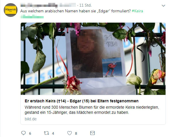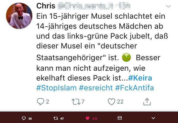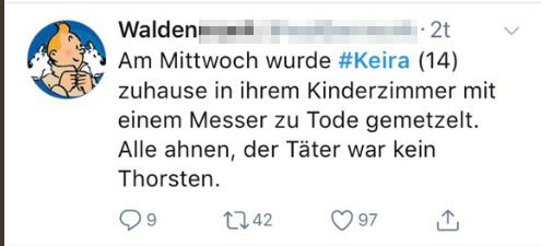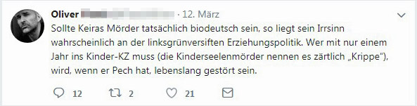 Wir wünschen Keiras Eltern und ihren Freund_innen viel Kraft, nach dem Verlust des Mädchens auch noch diese Agitation in den Sozialen Netzwerken zu ertragen.