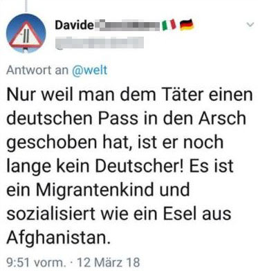 Nun ergeben die Polizeiermittlungen, dass es sich um einen 15-jährigen deutschen Täter handelt. Aber deutsch, raunt da sofort die rechte Internetszene, was heißt das heutzutage schon?
